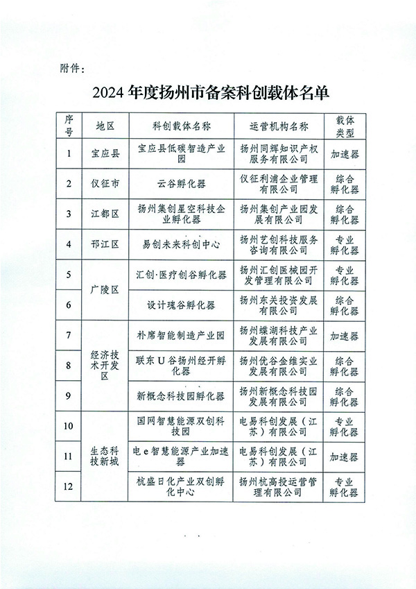 揚科發(fā)〔2024〕60號-關(guān)于公布2024年度市級備案科創(chuàng)載體的通知 |